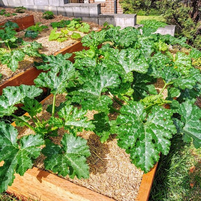 Zucchini goes by many names, including Courgette, Squash, Marrow and Summer Squash. This annual vine produces very large distinctive green leaves, with some cultivars boasting a display of silvery/white patterned leaves that are absolutely stunning. The plants grow into a large compact bush and as the season progresses they begin to sprawl out in a vine like manner, reaching up to 3m in length.